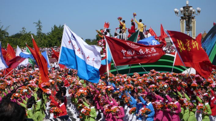 正值建国60周年,中国人民大学的1600余名学生参与组成建国60周年群众游行“北京奥运”方阵,走上长安街、走过天安门,感受到百川汇河、涓滴成海的伟大魅力,中国人民大学的脉搏再一次与时代共振。